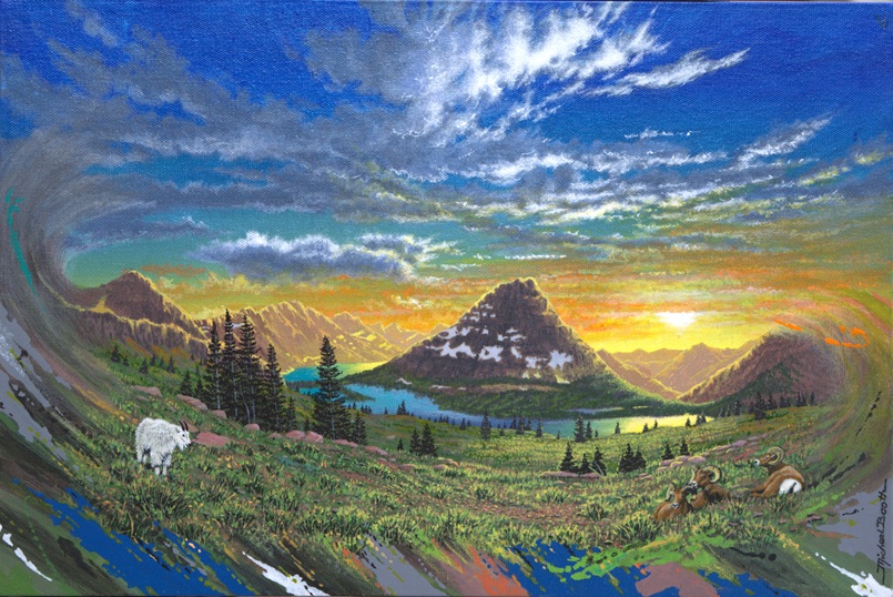 This is an original acrylic on canvas painting of a popular scene in Glacier National Park, Montana by Michael Booth. A masterful composition of an array of high-country wildlife and splendid landscape. Canvas size 12″ tall by 18″ wide. Only the highest quality canvas and longevity-proven paint materials used. Free shipping within the U.S.